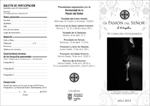 CONCURSO DE FOTOGRAFÍA Se ha convocado el XIV Premio Fotográfico “La Pasión del Señor” 2013, cuyas bases se pueden recoger en el local de la Hermandad o a través de la web: BASES CONCURSO FOTOGRAFICO Y BOLETIN DE PARTICIPACION |
